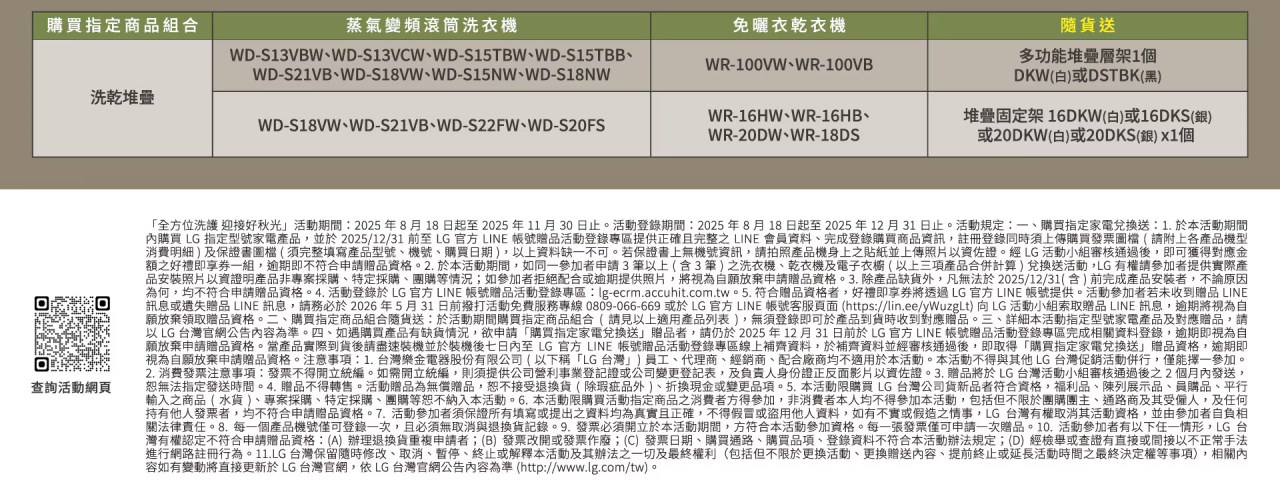5. 本活動限購買 LG 台灣公司貨新品者符合資格,福利品、陳列展示品、員購品、平行輸入之商品(水貨)、專案採購、特定採購、團購等恕不納入本活動。