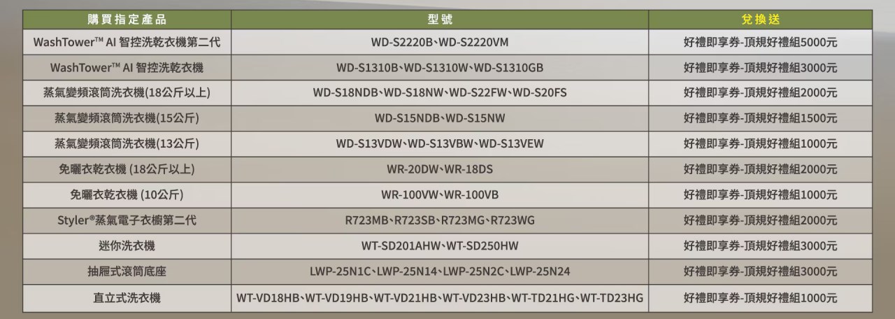一、 購買指定家電兌換送:於活動期間購買指定型號家電產品(請見以下適用產品列表),並完成活動登錄後,即可兌換獲得價值新台幣1000元至5,000元的頂規好禮即享券。
