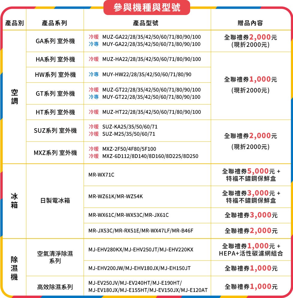 2025.10.1-2026.1.31活動期間內,至實體通路購買活動指定機種,並於2026.2.10前上網完成發票及保固書登錄,經活動小組審核資料齊全且無誤,即可獲指定面額全聯禮券,特定機型冰箱及除濕機再加碼送保鮮盒、HEPA+活性碳濾網/組。