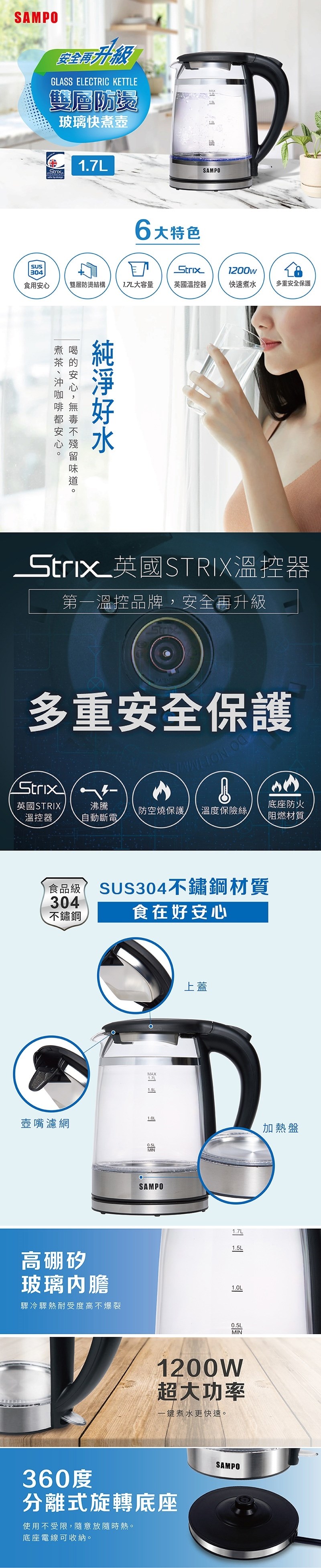 【SAMPO聲寶】1.7L雙層防燙玻璃快煮壺
