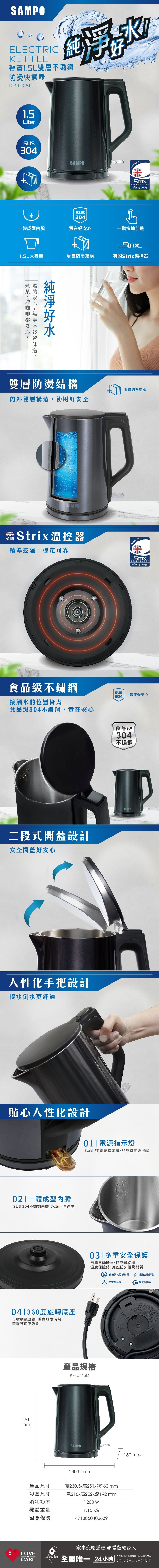 【SAMPO聲寶】1.5L雙層不鏽鋼防燙快煮壺