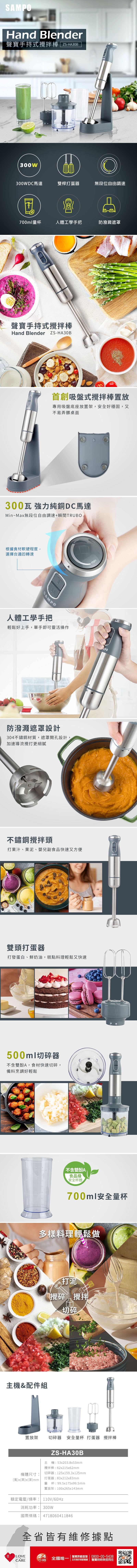【SAMPO聲寶】手持式攪拌棒(附打蛋器/切碎器/量杯/置放架)