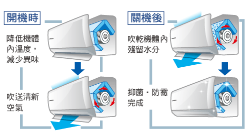 藉由凍結空調機內的熱交換器,使附著的灰塵、黴菌和油污從鰭片表面脫離,並困在結霜層中。當積聚的霜瞬間被融解時,原本在於結霜層中的污垢將隨著一起被帶出,通過排水管排到外面。定期執行可有效減少因灰塵堵塞而導致的性能降低並同時節省電費