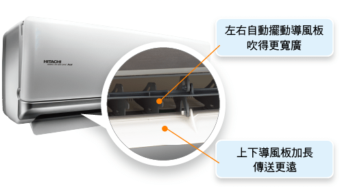 一般冷氣只有上下自動擺動的導風板,冷氣吹送的範圍受限;日立冷氣不僅將上下導風板加長,並新增左右方向可自動擺動的導風板,使冷氣吹出角度更大、傳送更遠,創造出3D立體舒適氣流,均勻分佈整個室內。