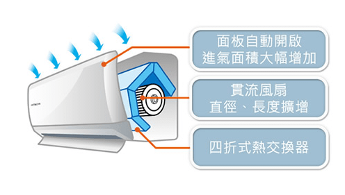 室內機面板自動開啟裝置,大幅增加進氣面積,並搭載四折式熱交換器,加上貫流風扇直徑、長度擴增,配合全新風道設計,CSPF能源效率1級,節能省電全面大提升