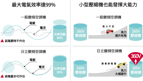 日立變頻冷氣採用日本制御技術,以超高頻度的輸出電壓,精準地控制脈幅調變系統,避免能源的損失,在負載大時,電壓能加大至360V(如同汽車加大油門)以提高迴轉速,同時電源功率因數可提昇至99%,速冷、速暖、更省電。