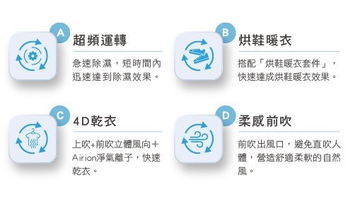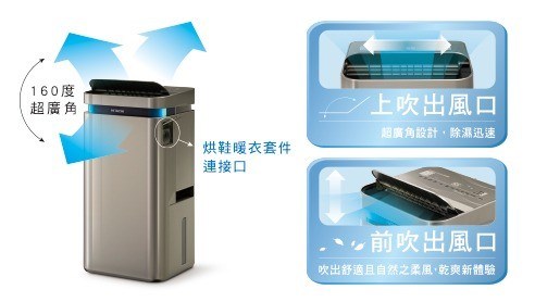 超廣角出風,滿足家中多種角度除濕需求、高效快乾。