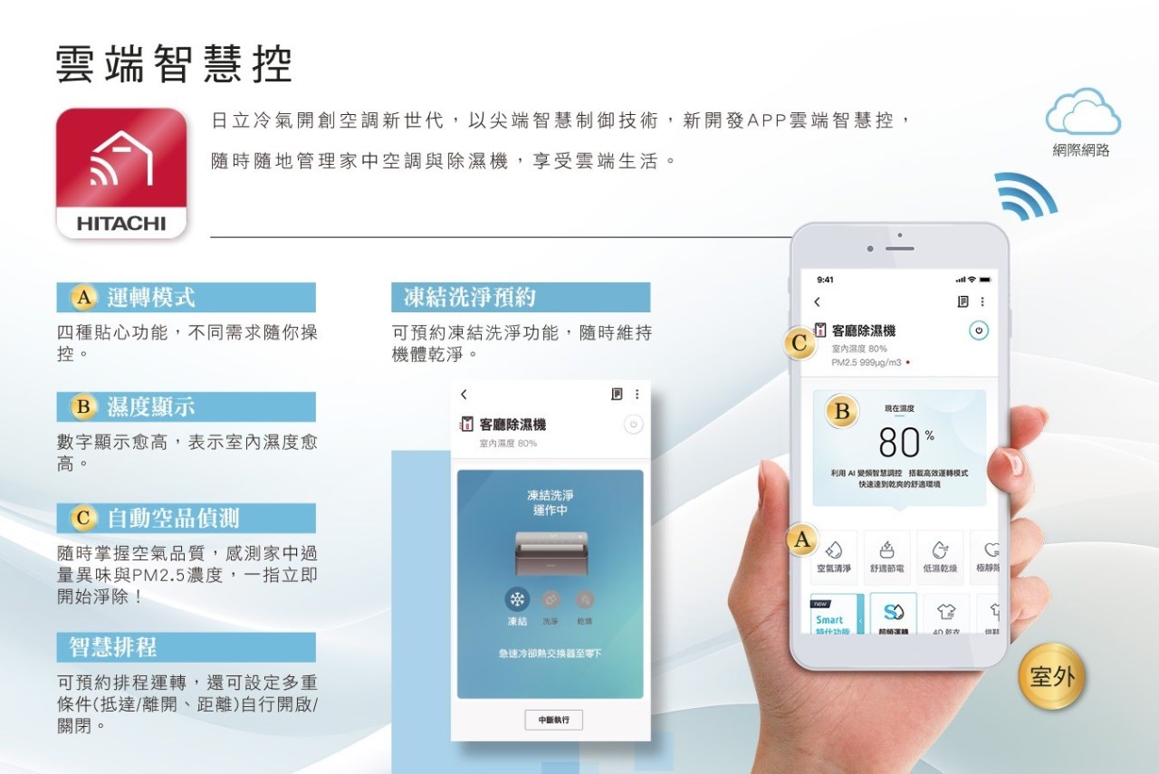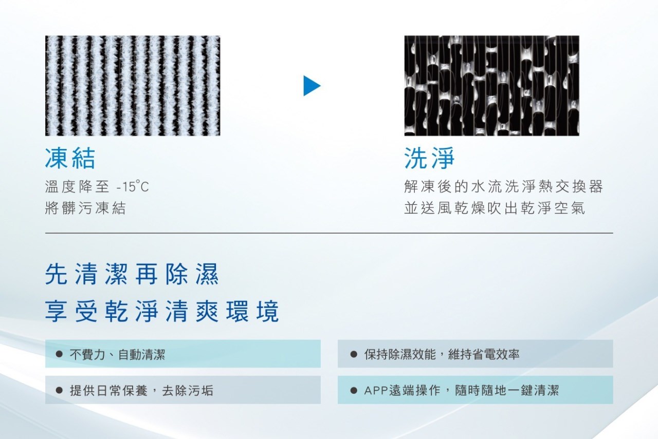日立除濕機首次搭載獨家凍結洗淨科技,定期執行可保持除濕效能,使機體內部乾燥、抑菌、避免異味。APP遠端操作,隨時隨地一鍵清潔。