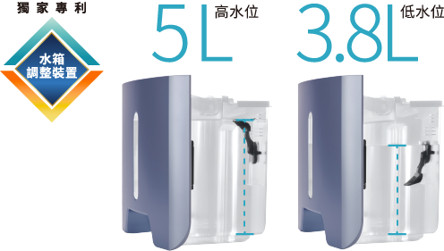 透過新型水箱調整裝置,可設定水箱容量滿水位為5L或3.8L,減輕重量讓家中成員能輕鬆倒水無負擔。