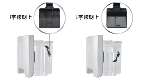 .H字樣朝上(尾部結構朝上)滿水為大容量