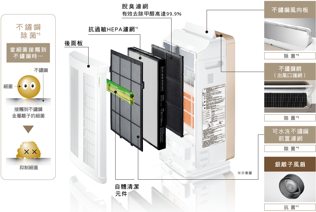 前置濾網、風向板與出風口護網都採用不鏽鋼材質,搭配內部銀離子風扇,可發揮除菌效果。