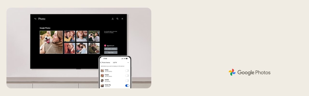 透過您的手機,即可將 Google 相簿帳戶與智慧顯示器無縫同步。運用您的私人影像收藏,為空間敘事增添一抹溫暖而真實的個人印記。