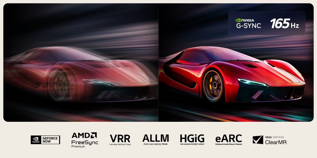 藉助 G-Sync 相容性、AMD FreeSync Premium、165Hz VRR(可變更新率)、0.1 毫秒像素反應時間以及 ClearMR 10000 認證,享受極致遊戲體驗。解決遊戲時螢幕撕裂、畫面卡頓和動態模糊問題。