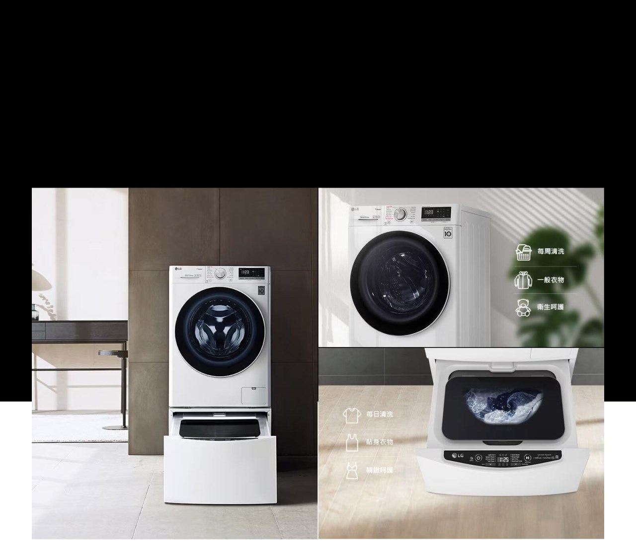 上置滾筒洗衣機清洗一般大量衣物,下搭TWINWash™Mini洗衣機,可同時清洗少量與精緻衣物。您可以同時清洗兩批衣物,所花費的時間更少、更輕鬆,有效降低一半的洗衣時間。一部雙機,更可節省安裝空間。