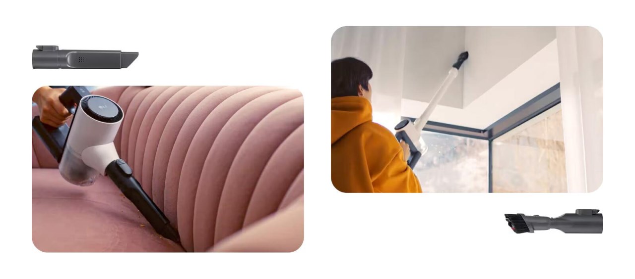 內建隙縫吸塵管,特殊斜口設計,不用加裝隙縫吸頭也可清潔隙縫,專為清潔難以觸及的位置而設計;並配有二合一毛刷&隙縫吸頭以清潔多樣化環境。