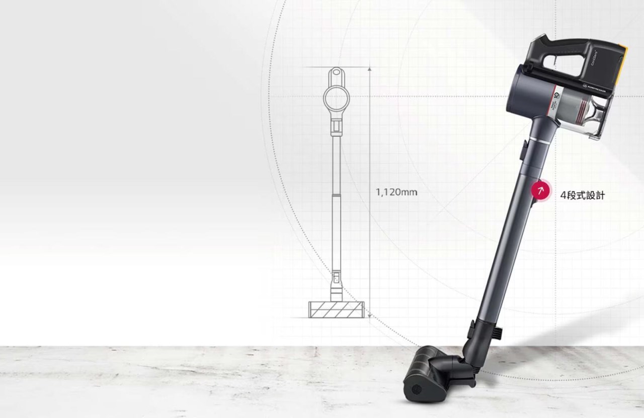 獨特伸縮吸塵管設計讓使用者依據身高調節最佳使用長度,減少身體負擔,同時也能有效節省收納空間。