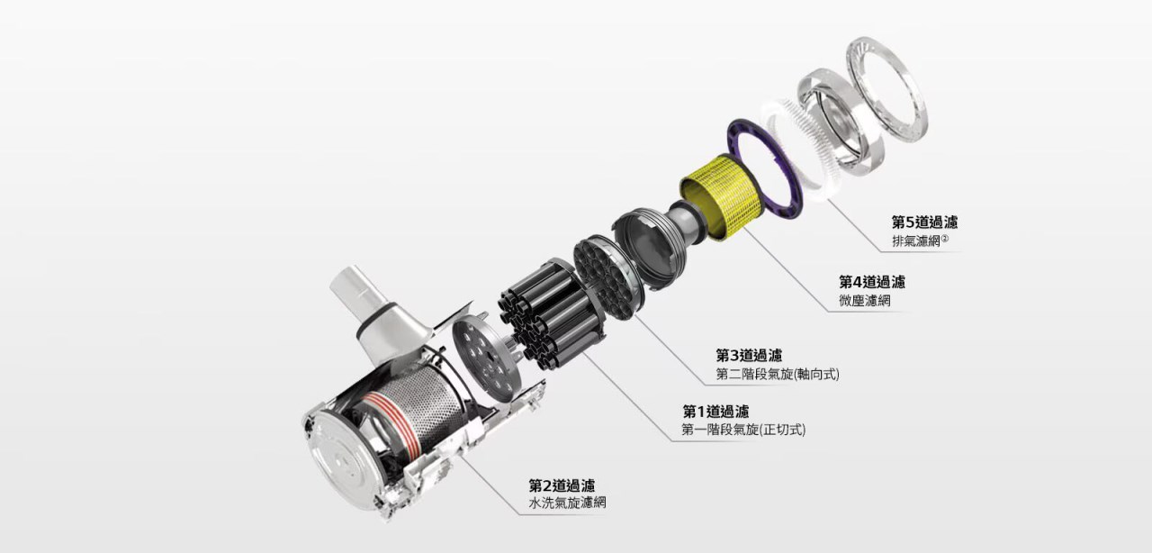 5道過濾程序能有效過濾① 99.9% 的懸浮微粒 (0.3微米),大部分的塵屑會在第1~3道程序被過濾並被留在集塵盒,而少量懸浮微粒則會在第4~5道程序被過濾。