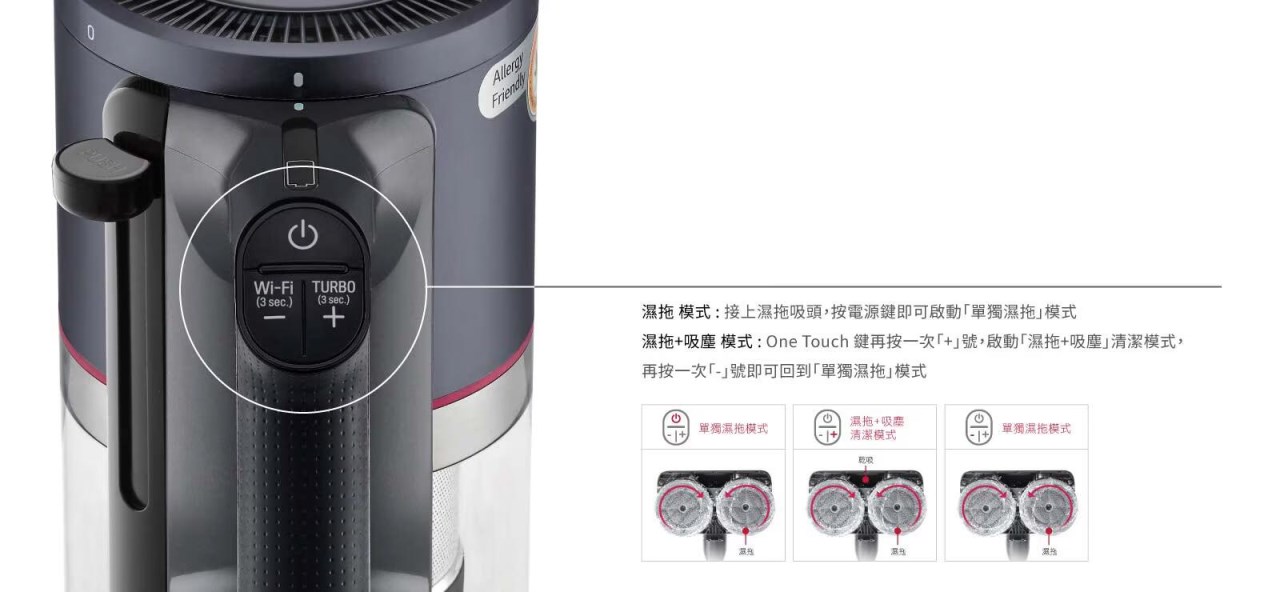 可啟動「單獨濕拖」,也可「同時濕拖+吸塵」